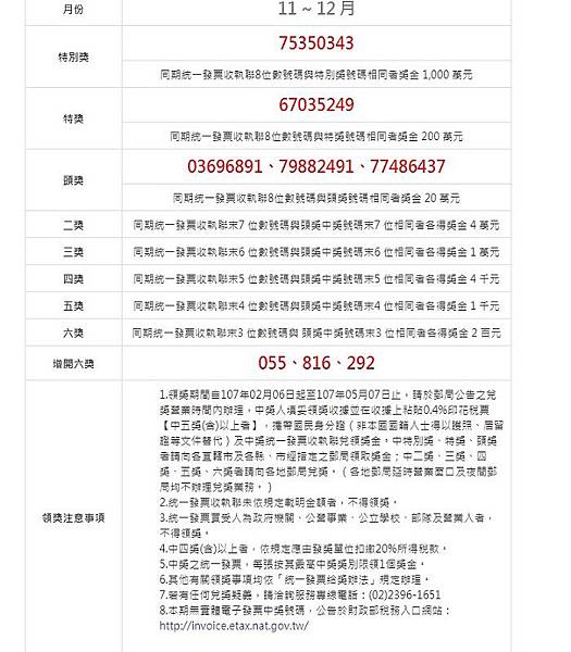 106年11-12月統一發票頭獎至六獎: