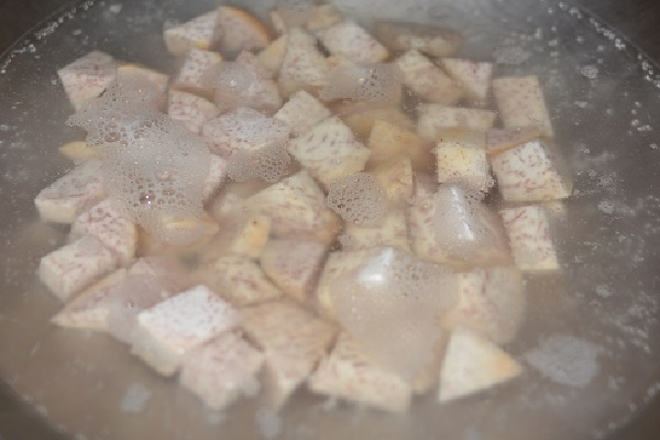 再放芋頭待大滾即可關火,粉漿沖入煮滾芋頭水攪拌至糊化