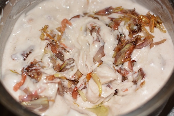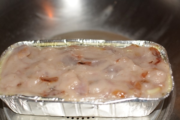 3. 加入油蔥絲,將芋頭米糊倒入模具鋪平,放入鍋中蒸熟即可