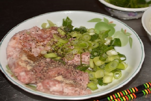 2.絞肉加入香油、醬油以及料酒、黑胡椒等調味續放蔥末,